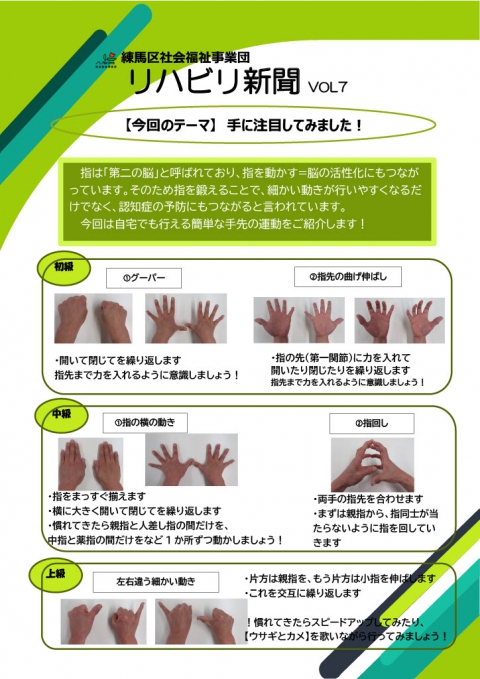 練馬区福祉事業団の通所介護施設(地域密着型は除く)には、 理学療法士・作業療法士等の資格を持った機能訓練指導員がリハビリを行っています。 リハビリってどういうものなのか、 何をしているのかをお伝え出来ないかと考えリハビリ新聞を作成しています。 今回第7弾は【手に注目してみました】について新聞を作成しました。 場所を問わない簡単な運動方法を紹介しています。 ぜひ1度ご覧ください!