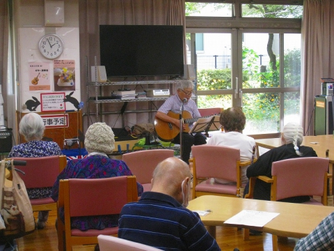 昨日はボランティアの青木さんによるギター演奏会でした。 この日の為に臨時利用されるファンの方もいらっしゃり、開演前 から膨らむ期待感!! そして期待に違わぬ素敵な演奏♪秋にふさわしい曲や、皆さま に馴染みのある歌謡曲、フォークソングを全部で12曲、一緒に 歌詞カードを見ながら歌っていただき、見事なハーモニーを 奏でられ、楽しいひと時をお過ごしいただきました。