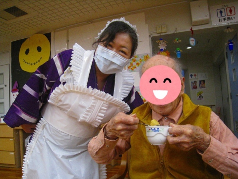 今日のおやつは好評(?)につき、懐かしの純喫茶を イメージし、昭和の映像を流したり、前回同様 看板娘に扮した職員が自作の衣装を身にまとい、 皆さまにプリン・アラモードをお配りしています。