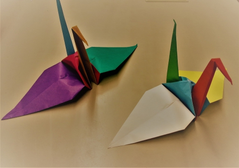 今月のに季節の折り紙は「5色の鶴」を作りました。 5枚の折り紙の色の配置を考え作ります。鮮やかで立派な2羽の鶴が出来上がりました。 出来上がりの作品をみて「早く飾りたーい」と笑顔いっぱいでした! 次回もお楽しみに✿