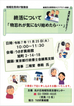 11月25日(火)10時~11時30分、 旭町2丁目にあるうさぎ美術館で 地域住民向け勉強会 終活について「物忘れが気になり始めたら・・・」を開催しました! 講師は東京都行政書士会練馬支部 理事 二階堂 泰範先生をお招きしました。 ...