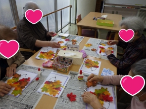 こんにちは(^o^) 10月の選択活動をご紹介! 今回は、 ・フクロウのカレンダー作り ・ハリネズミの落ち葉アート 皆さま、見本を見ながら丁寧に 作られていました(*^-^*) フクロウの目は、ご自分で描いていただき 色々な表情のフクロウが完成!(^^)! ハリネズミの落ち葉アートも 落ち葉の貼り方で個性的な作品が 完成しました!(^^)!