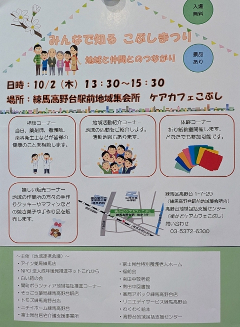 練馬高野台駅前地域集会所 ケアカフェこぶしにて、こぶしまつりが開催されます。