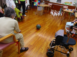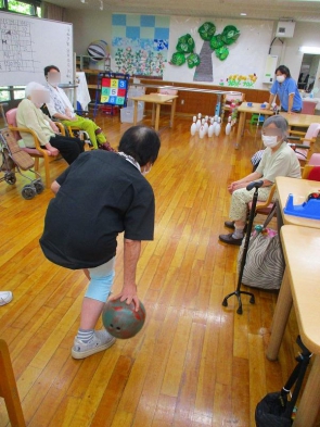 今日の午後の趣味活動の時間は、床をレーンに見立て、 デイルームでボウリング大会が開催されました。