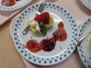 おやつもいちごののったロールケーキと