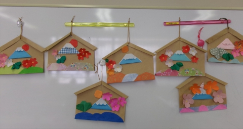 1月13日に「季節の折紙」の事業を行いました。 今の時期にピッタリ!「富士山の絵馬」をつくりました。縁起が良い素敵な絵馬が完成しました。 封筒を絵馬に見立て雪化粧した富士山と松、梅を作成しました。参加者は梅を切る作業に苦労しているようでした。 次回の作品も楽しみですね。