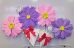 今月の折り紙は、何とも可愛らしいお花を折りました。一枚の折り紙を九等分してそのうちの8枚を花びらに使いました。花びらを折って組んでいく工程は、なかなか大変な作業でしたが、出来たお花をブーケにしたらパッと華やいだ感じに!お部屋に飾ったら...