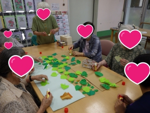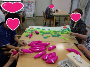 こんにちは(^O^) 秋の壁面飾りをご紹介します‼ 練馬デイのデイルームには 壁面飾りが2つあります☆彡 9月は、さつまいも畑の壁面飾り 10月は、コスモスの壁面飾り お客様と職員で協力して制作しました‼ デイルームは もうすっかり秋に(*^-^*) 11月は「何を作ろうかな~」と検討中です! お楽しみに♡