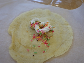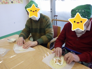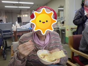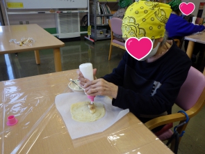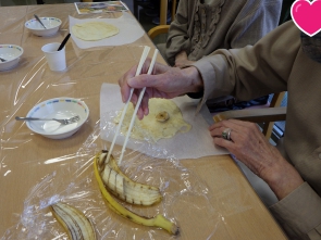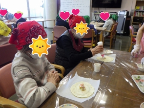 こんにちは(^^)/ 12/15(月)午後の活動で クレープ作りをしました! 職員が焼いた焼きたてのクレープ生地に バナナとホイップクリーム、 スプレーチョコをトッピング♡ クレープ生地でつつんで完成です!(^^)! 温かい紅茶と一緒に 『いただきます(^o^)』 皆様、美味しそうに召し上がっていました(^o^)/ 次回のおやつ作りもお楽しみに(^_-)-☆