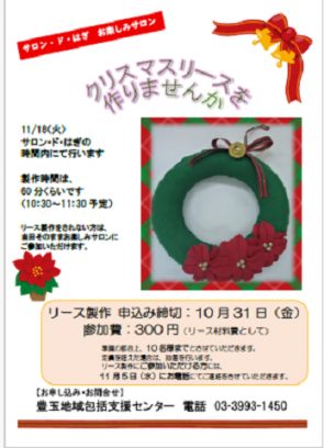 特別企画「クリスマスリース製作」もございます(リース作りは、抽選10名様となります)。