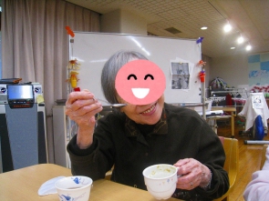 今日のおやつは好評(?)につき、懐かしの純喫茶を イメージし、昭和の映像を流したり、前回同様 看板娘に扮した職員が自作の衣装を身にまとい、 皆さまにプリン・アラモードをお配りしています。