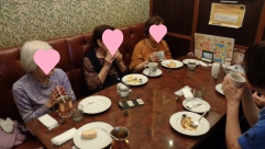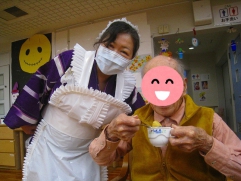今日のおやつは好評(?)につき、懐かしの純喫茶を イメージし、昭和の映像を流したり、前回同様 看板娘に扮した職員が自作の衣装を身にまとい、 皆さまにプリン・アラモードをお配りしています。
