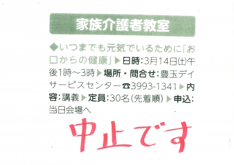 新型コロナウイルス感染症への対応として 豊玉デイサービスセンターにて開催予定でした 家族介護者教室 ◆いつまでも元気でいるために「お口からの健康」 を中止させていただきます。 楽しみにされていた皆様、ご迷惑をお掛けしますが 何卒ご理解、ご協力をお願いいたします。 ねりま区報 3月1日号 9ページ 情報あらかると 家族介護者教室 に掲載