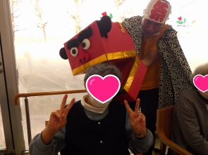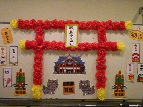 新年会では 練馬デイ神社が登場!(^^)! 皆で初詣☆彡 おみくじを引き、絵馬を書きました(^O^) 獅子舞も登場‼ 頭を噛んでもらい 無病息災\(^o^)/ 最後に だるま落としゲームをして 大盛り上がりの新年会でした(^_-)-☆