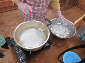 6.5円玉程度の大きさに成形し沸騰した鍋でゆでる。