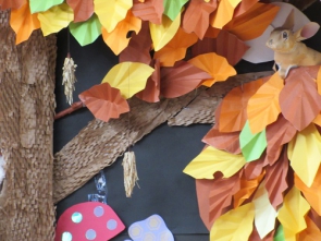 当デイルーム入り口には お客様と職員で作った 力作が展示されています。 リス、みみずく、フクロウ などかわいい動物がお出迎え、 よく見るとミノムシもいます。 お客様より、 「ミミズクかわいいね」 「リスもかわいいよ」 「ミノムシ最近見ないね」 等、色々な感想が聞かれました。