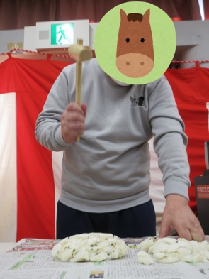 1月12日に昨年お客様が作られた 鏡餅を使い、「鏡開き」を行いました。 来所されたお客様、交代交代で 木槌を持っていただき、 鏡餅を叩いて頂きました。 ・・・が、鏡餅がかなり固く ひびを入れかけさせる のがやっとでしたが、 お客様は割れた餅を見て大喜びでした。