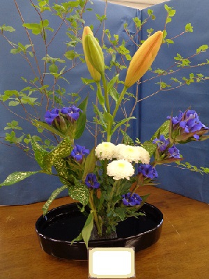 10月17日に有料の活動プログラム『華道』を開催しました。 今月の花材は、ドウダンツツジ・リンドウ・スカシユリ・スプレーポンポンマム。 青花瓶や黒楕円花器、ガラス花瓶など、お好きな花瓶をお選びいただき活けていきます。 思い思いに切って活けていき、秋を感じる、とても素敵な作品が出来上がりました!