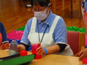 第二種目は色分け競争。落ちてくる赤、青のボールをそれぞれの色のついたコップでキャッチ