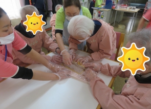 皆さんで協力してスポンジケーキを丸めて、