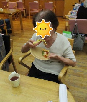 職員が3種類のピザの中からお好きな物をお聞きし取り分け、熱々のピザを召し上がって頂きました。ピザが苦手なお客様にはアイスクリームを提供し、普段と違う楽しいひと時を過ごして頂きました。お客様からは「色々なピザが食べれて楽しい!」「もう少し食べたい!」との感想を頂きました。