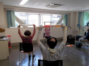 タオルをしっかり持ちながら腕を伸ばし、講師の動きに合わせて身体を動かしました。